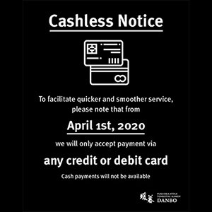 To facilitate quicker and smoother service, please note that from April 1st, 2020, we will only accept payment via any credit or debit card. Cash payments will not be available.